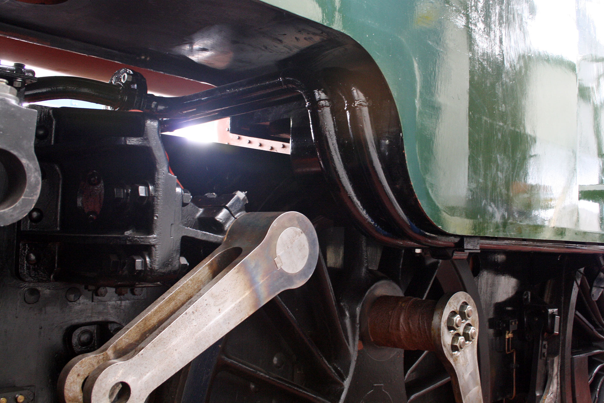 A short section of the carriage warming pipe has been fitted on the right-hand side of the loco but the right-hand tank needs to be fitted in order to continue the pipe run to where it turns inside the main frame.